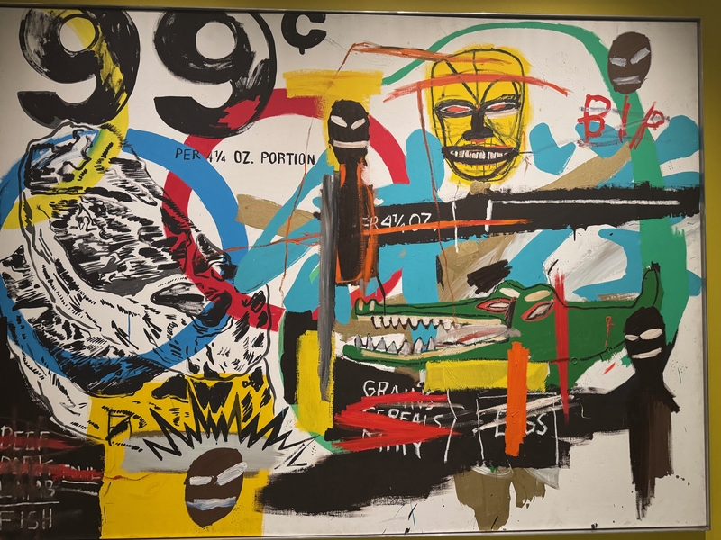 Внезапно ко мне подбежала яркая (в стиле фовизма) дама лет эдак от 25-и до 55-и (сейчас я точнее не определяю) и обратилась в восторженном тоне, как к давнему единомышленнику и ценителю прекрасного. По-видимому, мой озадаченный вид был считан ею как эмоциональное потрясение увиденным. Дама сказала, что мы таки родственные души, она тоже в экстазе от этой картины, искала ее и ездила за ней по всей Европе и вот - свершилось! Ладно Энди Уорхол - видели мы его, перевидели, а вот Жан-Мишель Баския - это апогей всего - кто понимает. "Давайте поговорим об этом в музейном кафе как близкие, тонко организованные и чувствительные натуры" - предложила она.